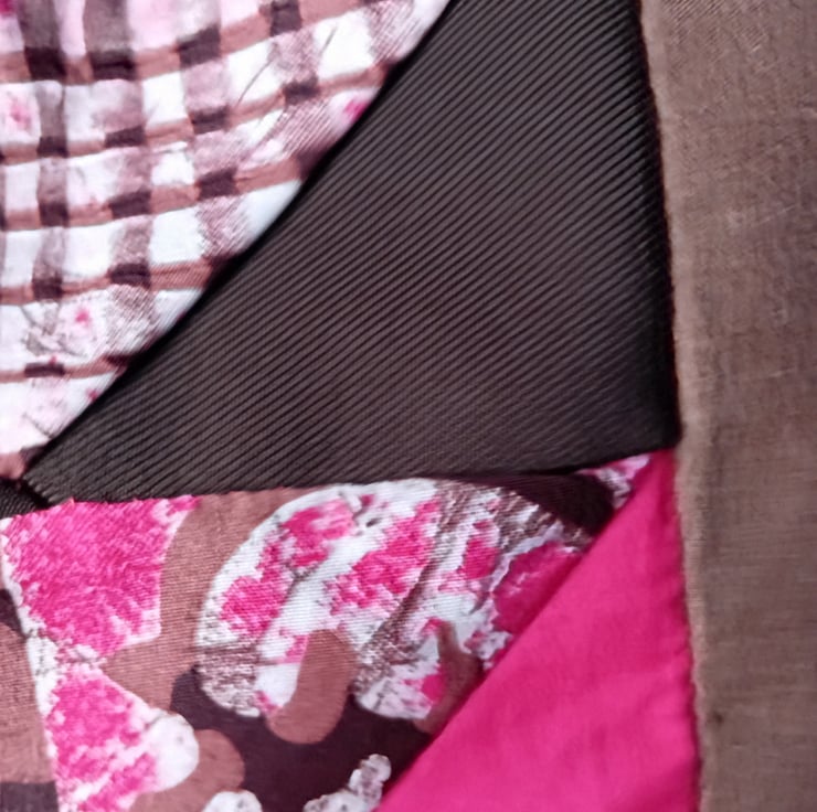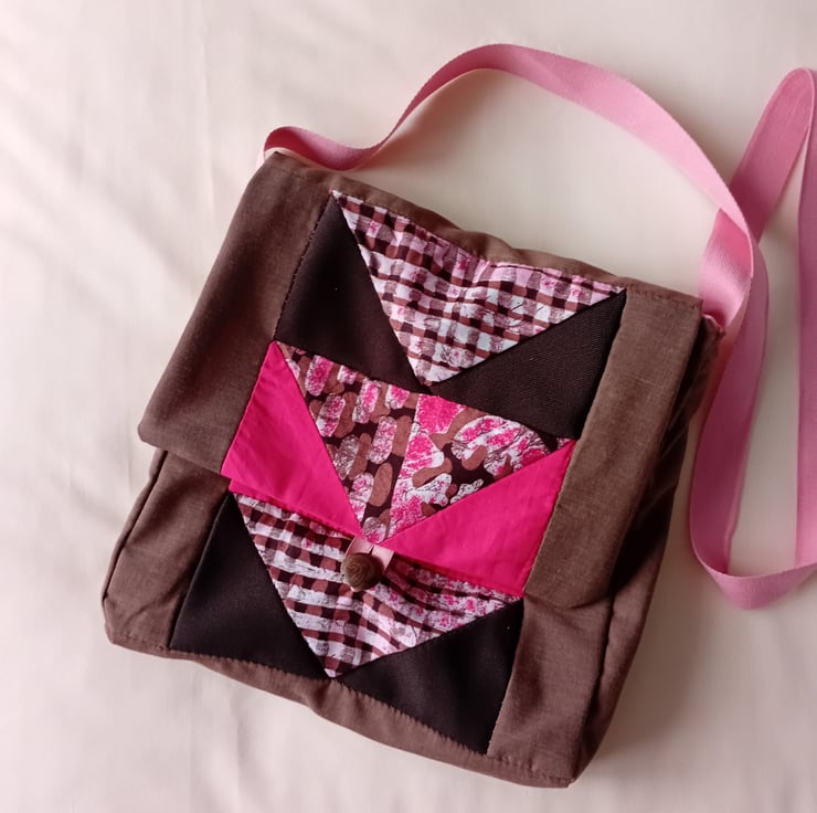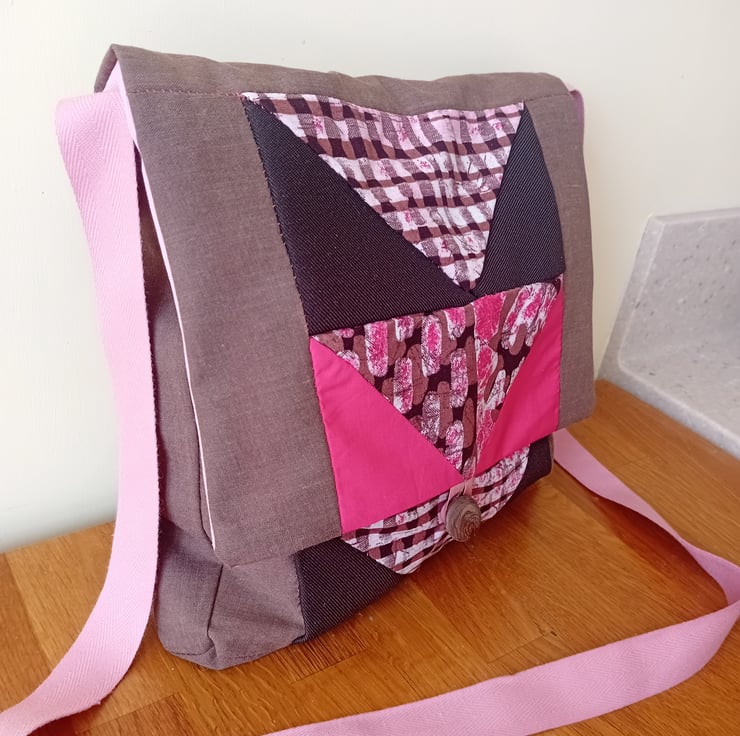 Patchwork shoulder bag in coordinating cotton fabrics, in brown and cerise. The bag is lined with pink nylon. It closes with a flap that fastens with a loop and button.