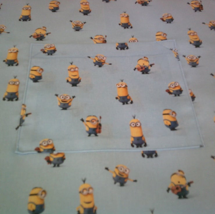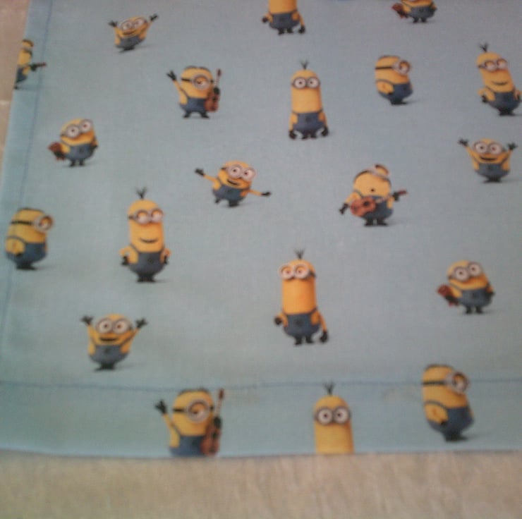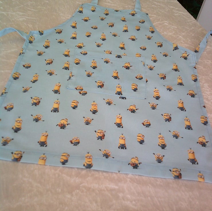 The design on fabric used for this apron is of Minions on a Pale Blue background.