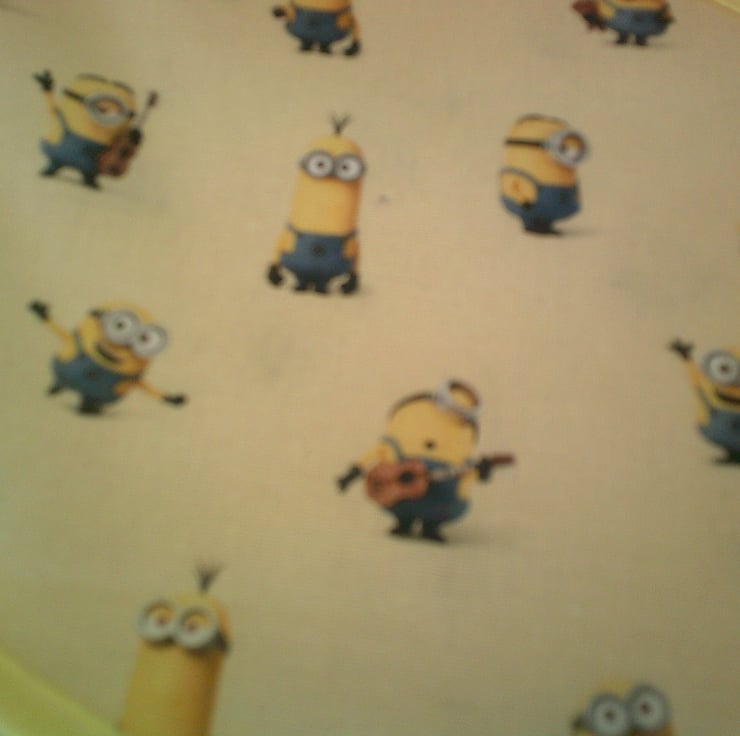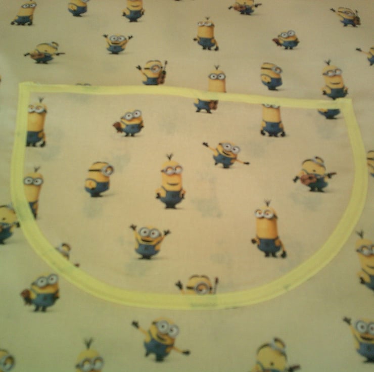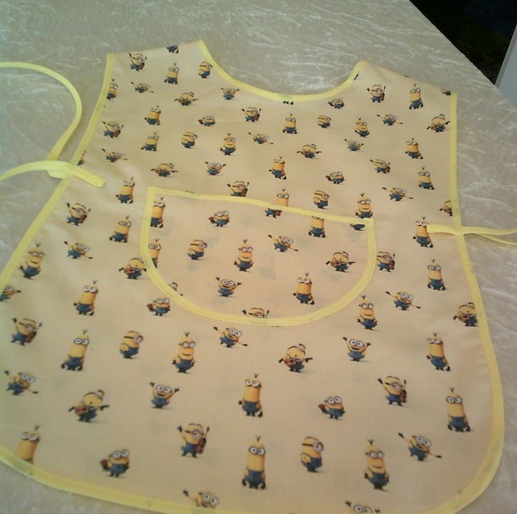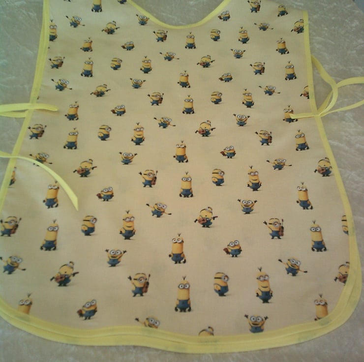 This child's tabard is made using 100% cotton fabric and has a design of minions on a pale yellow background and is edged with contrasting yellow bias binding. There is a pocket on the front and ties on the sides
