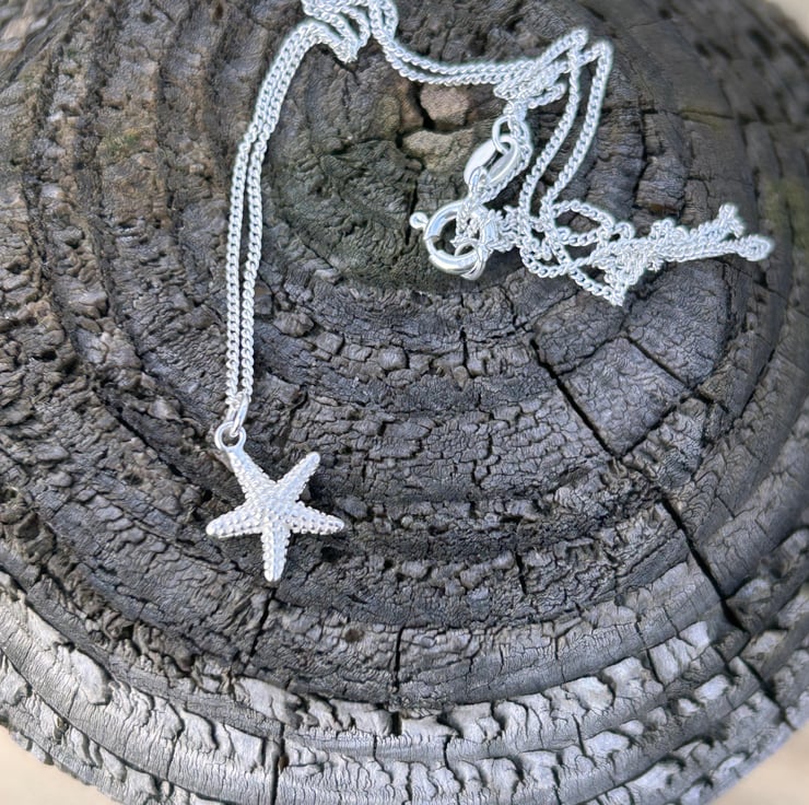 silver hand cast starfish set on a silver chain.