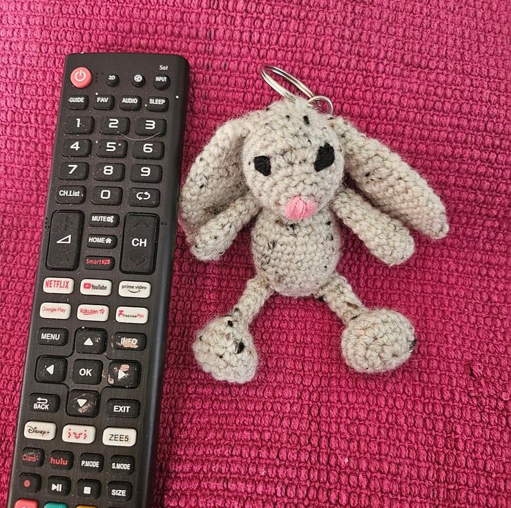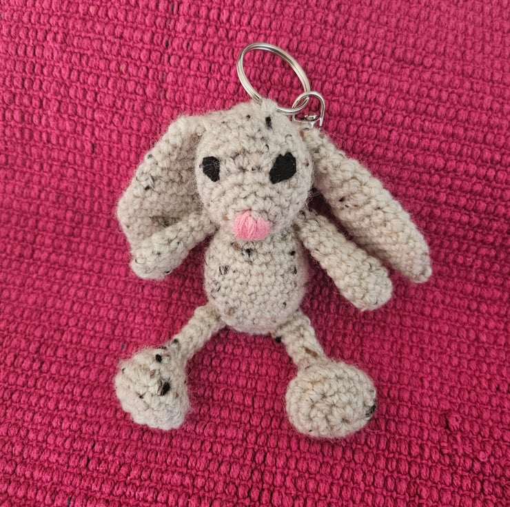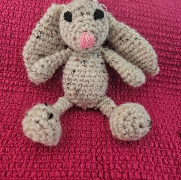 Crocheted floppy bunny keyring using DK yarn.