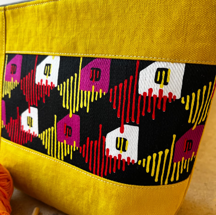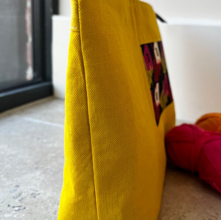 Featuring two panels of vibrant seventies printed fabric framed with yellow linen blend twill - all taken from sample swatches.