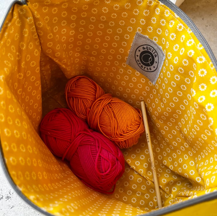 The bag is lined with pretty ochre floral cotton. This spacious pouch measures 27cm across the zip by 18cm tall. The bottom is boxed to give volume. There is a layer of interfacing to give structure. A strip of leather is tied to the zip pull. This can be swapped for ribbon on request.