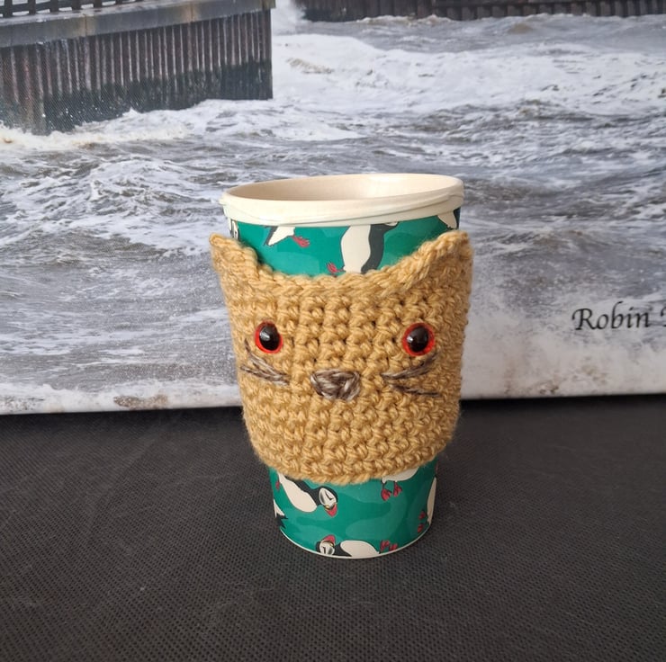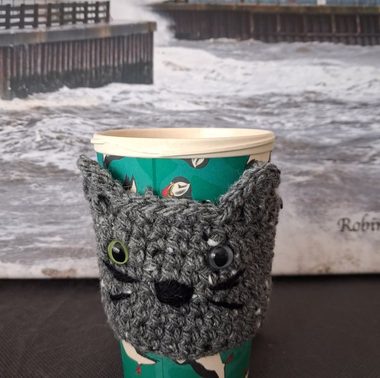 This is a pair of crochet sleeves, grey and brown, for a re usable coffee cup. The items are in a form of a cat with plastic safety eyes, whiskers and a cute tail. Please note cup not included.