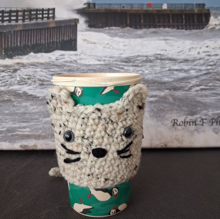 This is a pair of crochet sleeves, white and oatmeal, for a re usable coffee cup. The items are in a form of a cat with plastic safety eyes, whiskers and a cute tail. Please note cup not included.