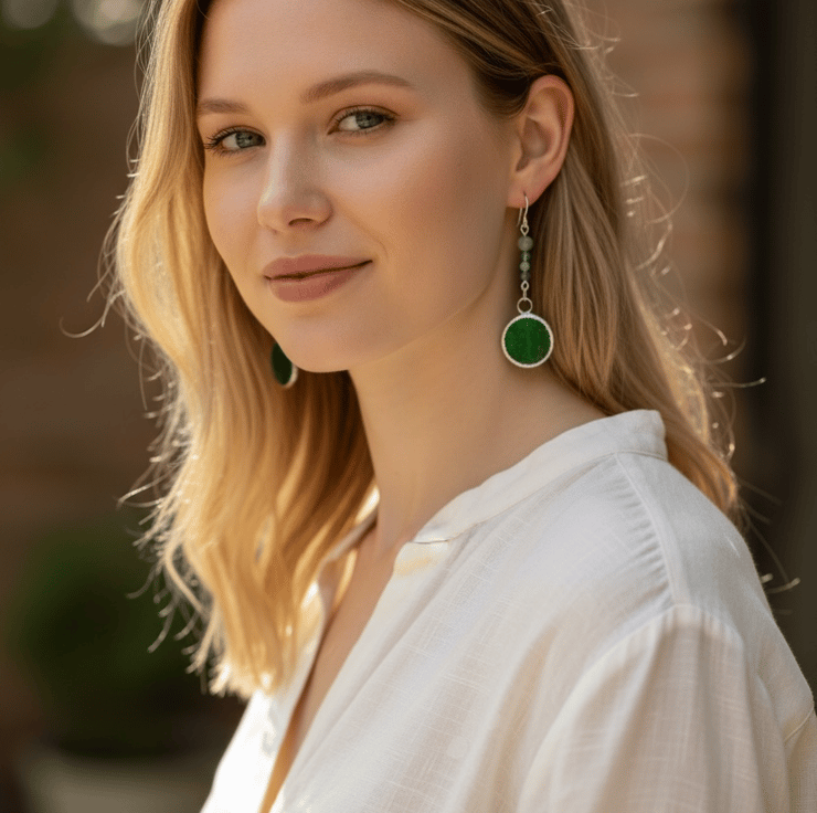 These beautiful vibrant sterling silver earrings include a semi precious Jade Stone, Indian Agate and a green coloured stained glass round pendant.