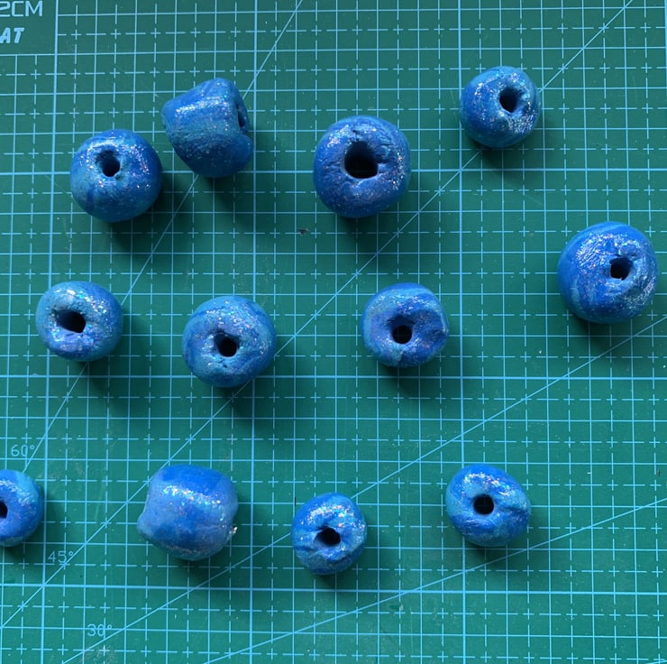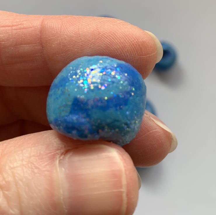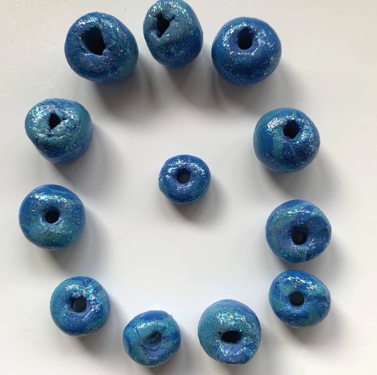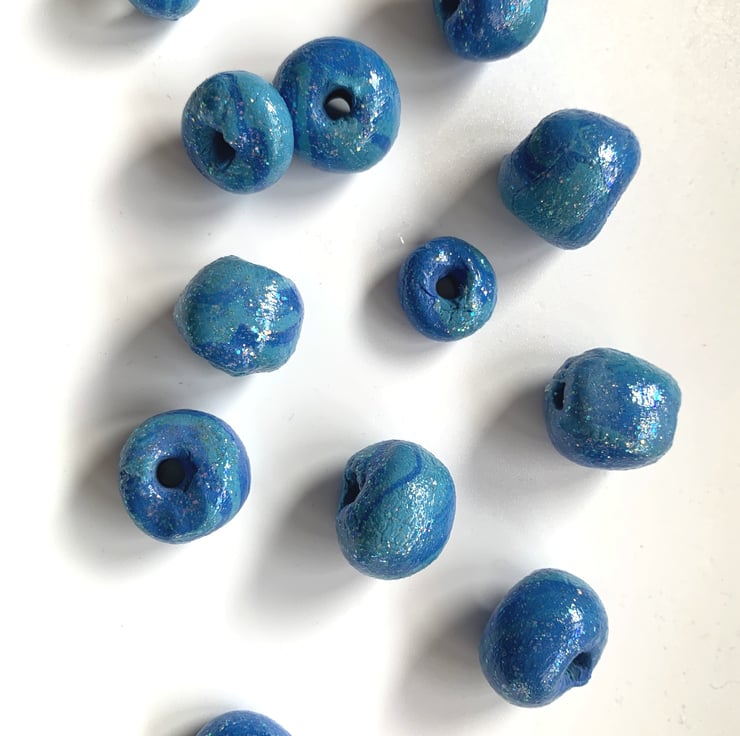 Made from two shades of blue, turquoise blue and royal blue, mixed so each bead is different. The material is air dry clay and so light the whole dozen don't even register on my postage scales. Coated / sealed with a super fine shimmer sealant. But because they are air dry clay, please do not get them wet.