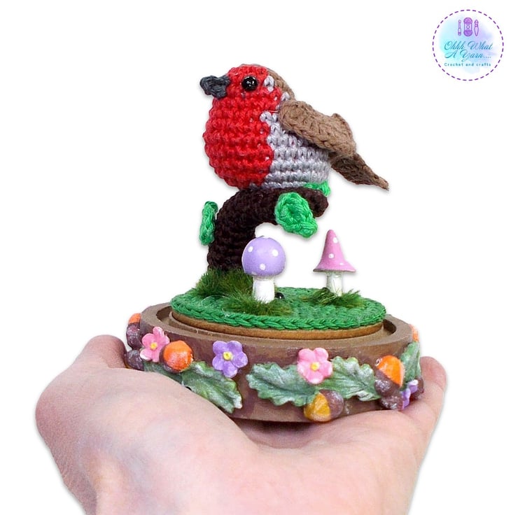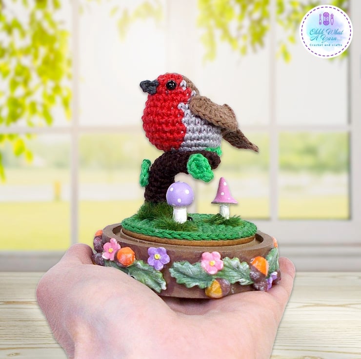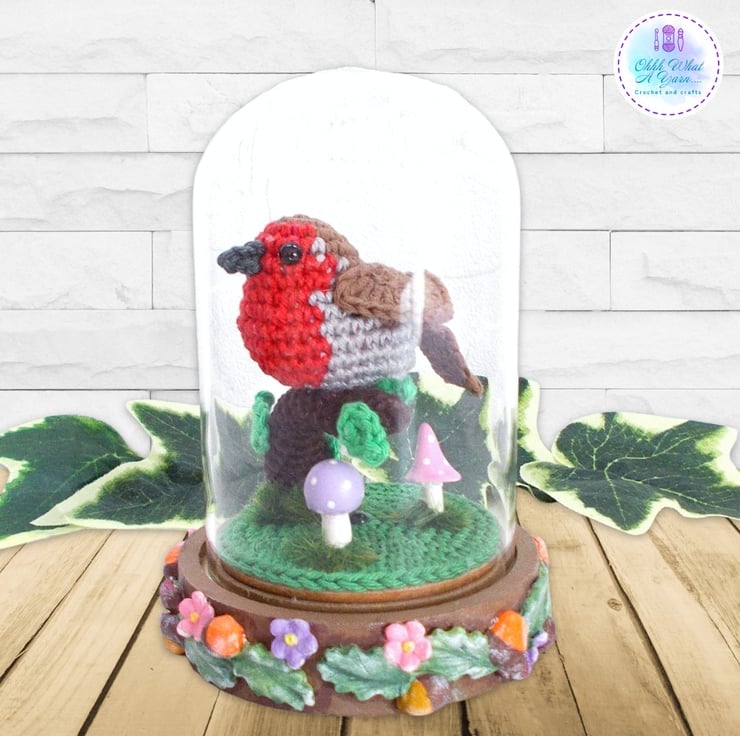 Crochet robin in decorative light up dome. Crochet ornament. Robin ornament.