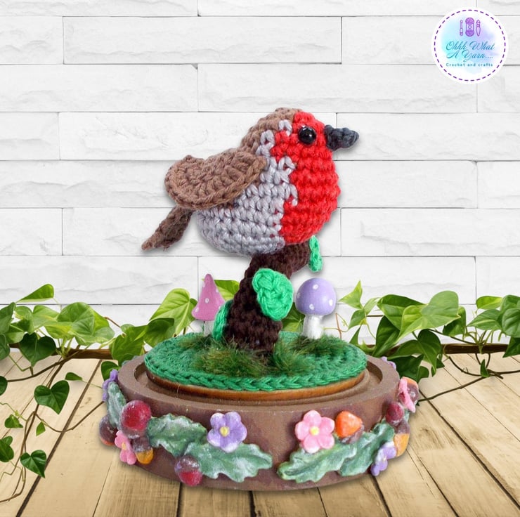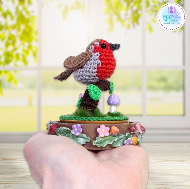 This cute little crochet robin is sat on a crochet tree branch decorated with crochet leaves.