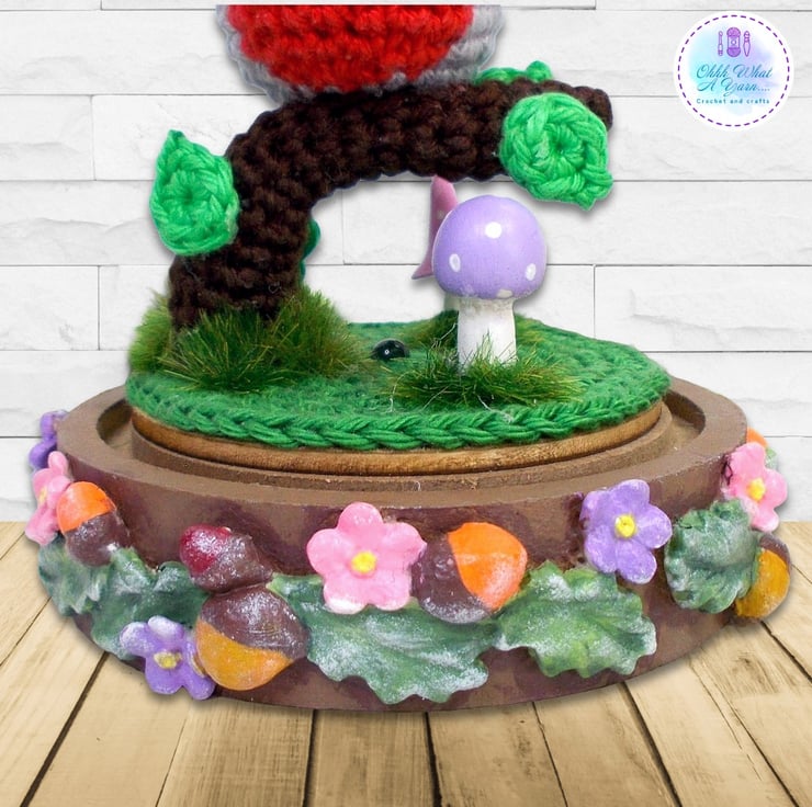 The tree is sat on a crochet bed of grass with faux grass mounds and 2 handmade and hand painted air dry clay toadstools.