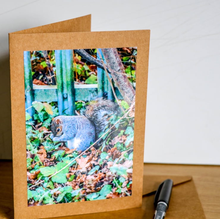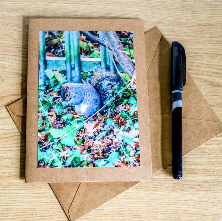 I spotted this Grey Squirrel whilst outside in the Norfolk countryside, busy eating something it had found in the undergrowth, totally not bothered by my presence. This is from an original image taken by myself in North Norfolk.. This is a 7 x 5 inch Greetings Card, professionally printed and mounted on Kraft Stock Card, and includes an eco friendly kraft envelope.. This has been left blank for you to include your own personal message.