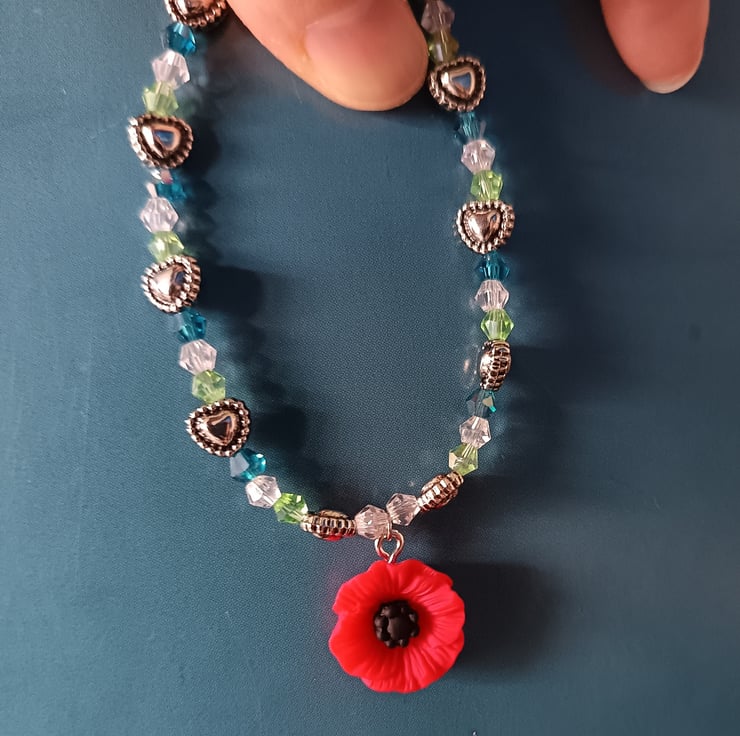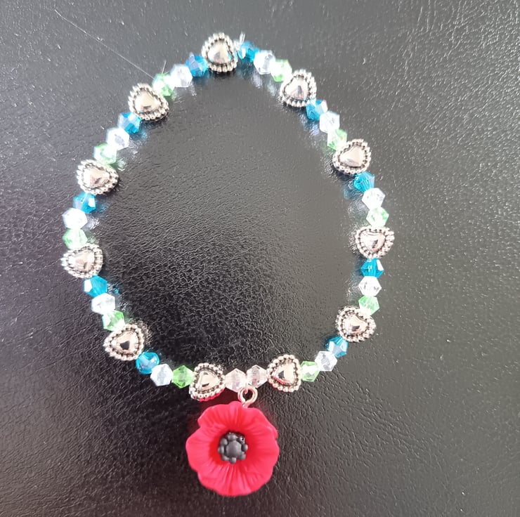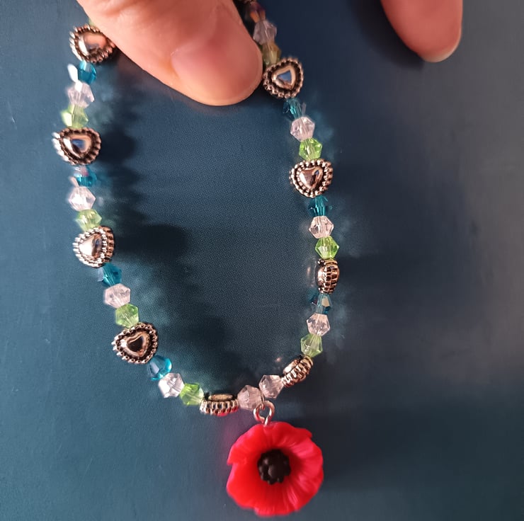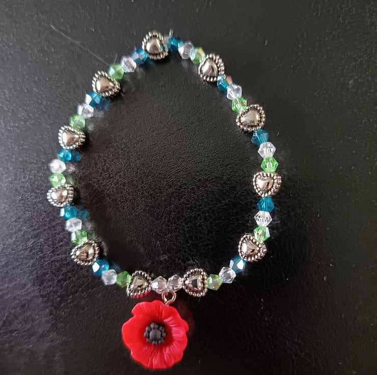 This handmade bracelet is crafted with magic stretch elastic, a hard resin poppy charm in bright red, silver heart-shaped beads and glass AB beads in clear, blue and green colours. Approximately 7 inches in size.
