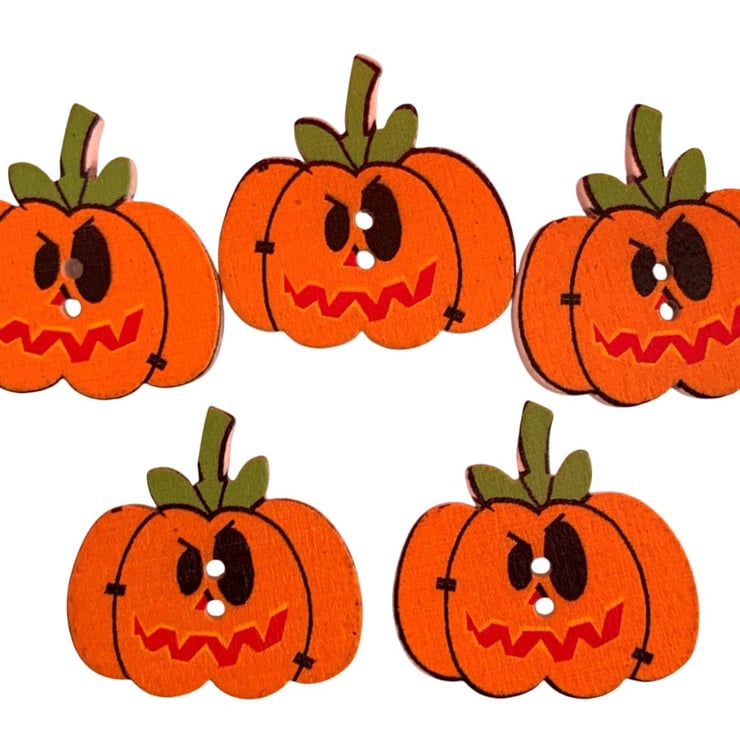 Set of 5 wooden buttons in the shape of grinning pumpkins.