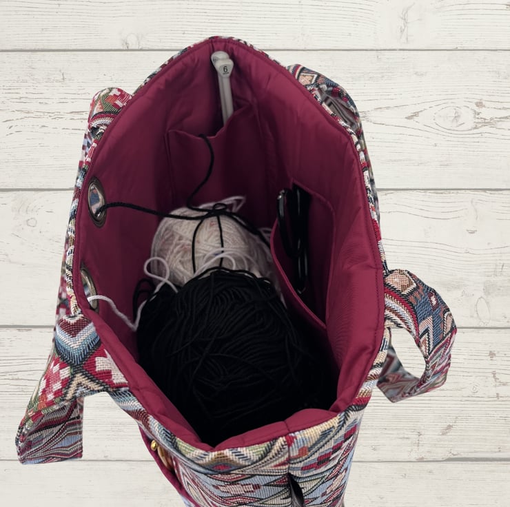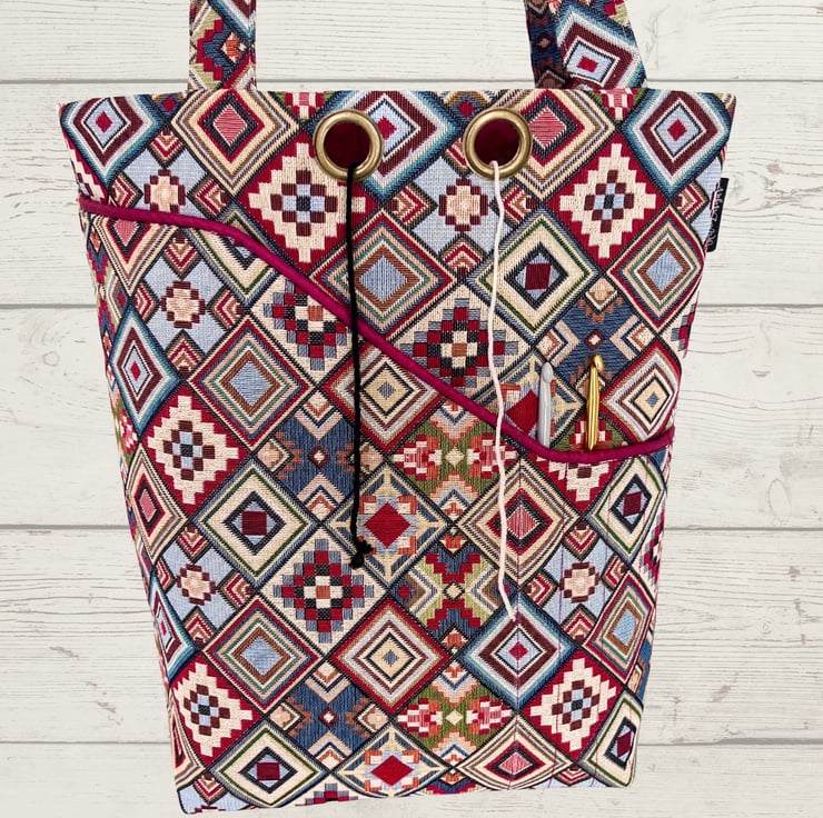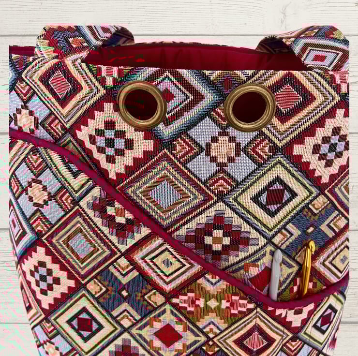 This colourful knitting project bag is made from a heavyweight tapestry fabric and lined with a dark red polyester