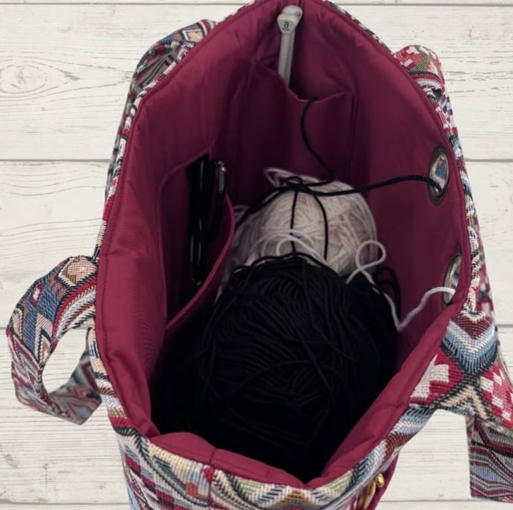 This unique knitting project bag is made from heavyweight upholstery tapestry fabric and lined with burgundy polyester.