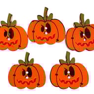 Set of 5 wooden buttons in the shape of grinning yellow / orange half moon wearing a Witch's hat in purple and black star pattern