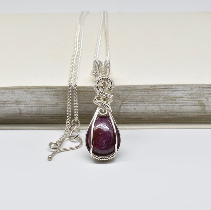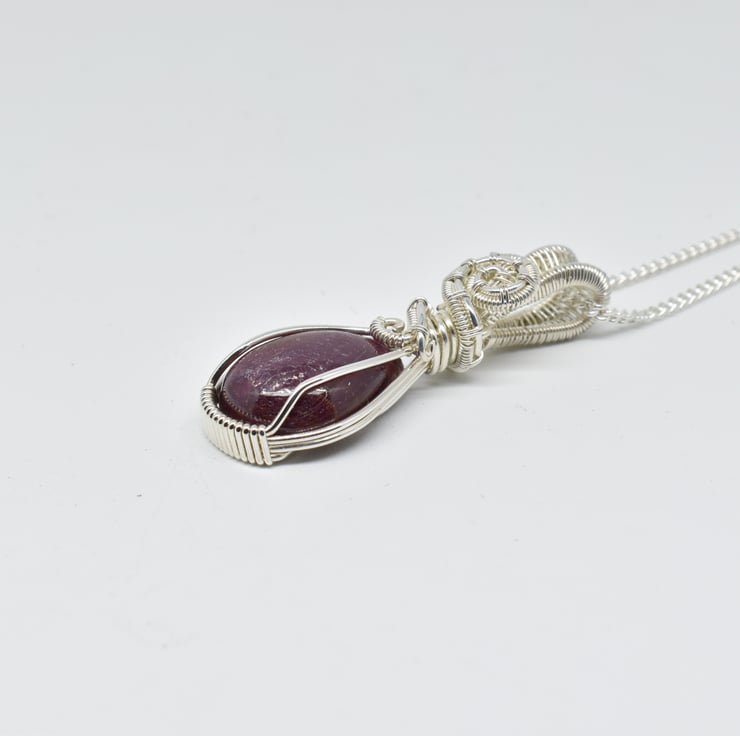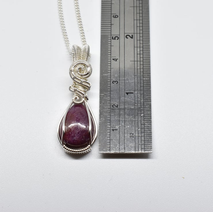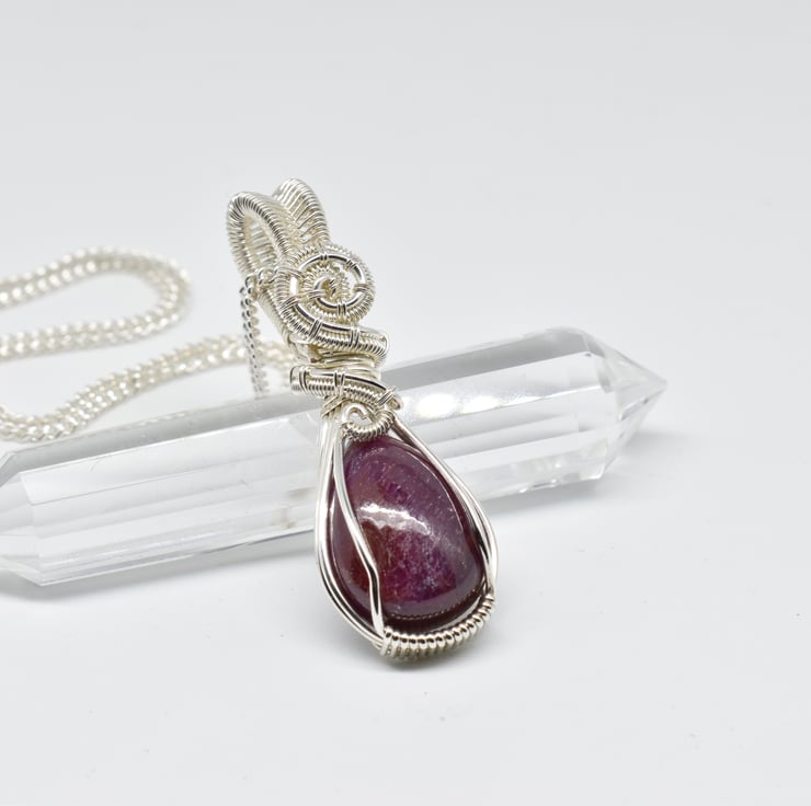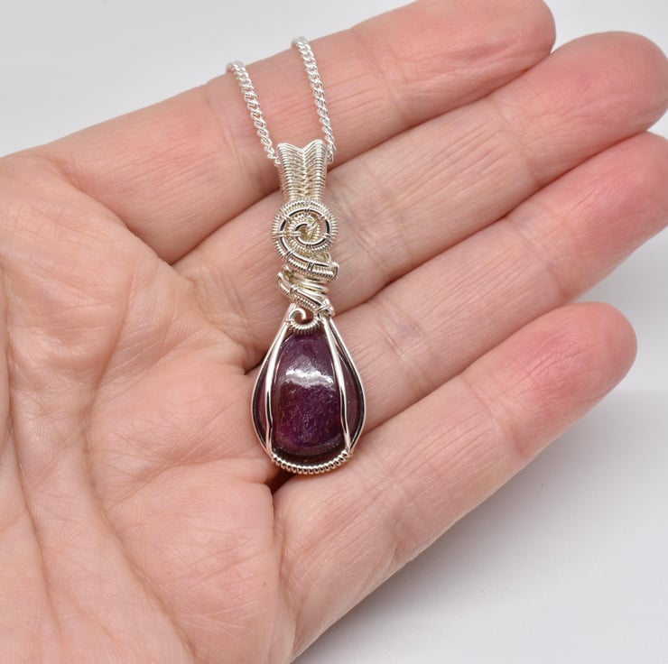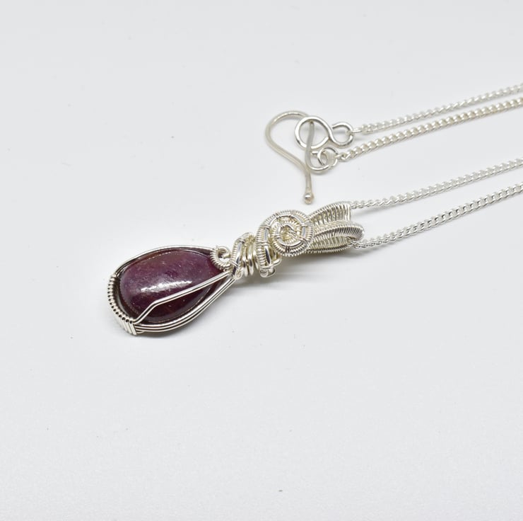I have wrapped and woven around this pretty Ruby using sterling and fine silver wire to make this dainty pendant. The thicker wires are sterling silver and the weaving wire is fine silver which is 99% pure.