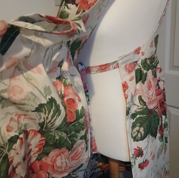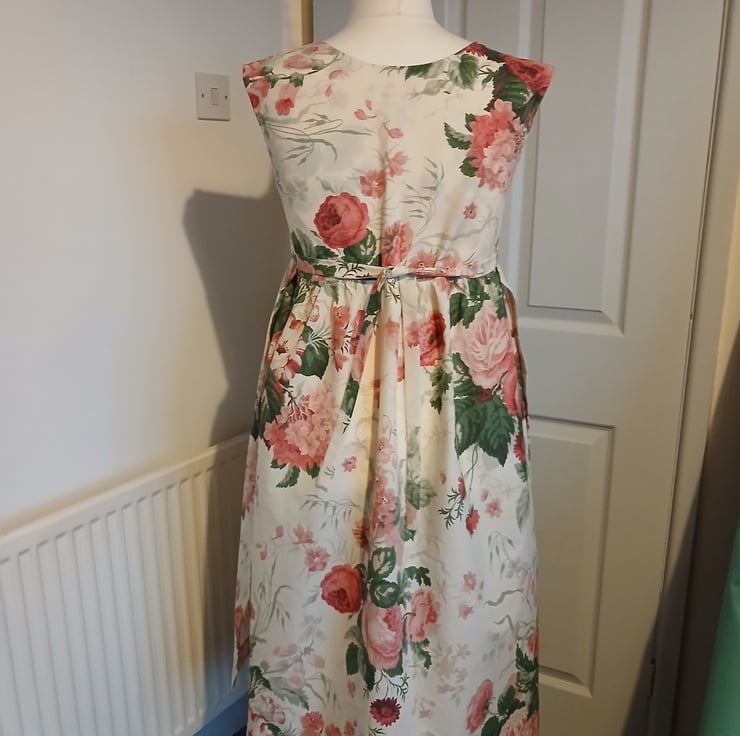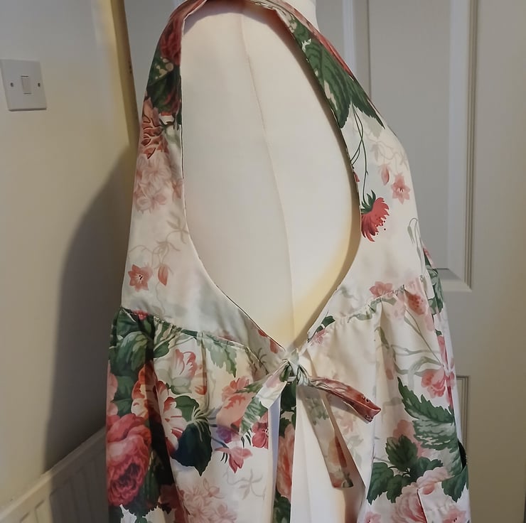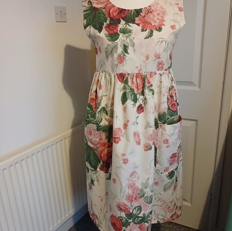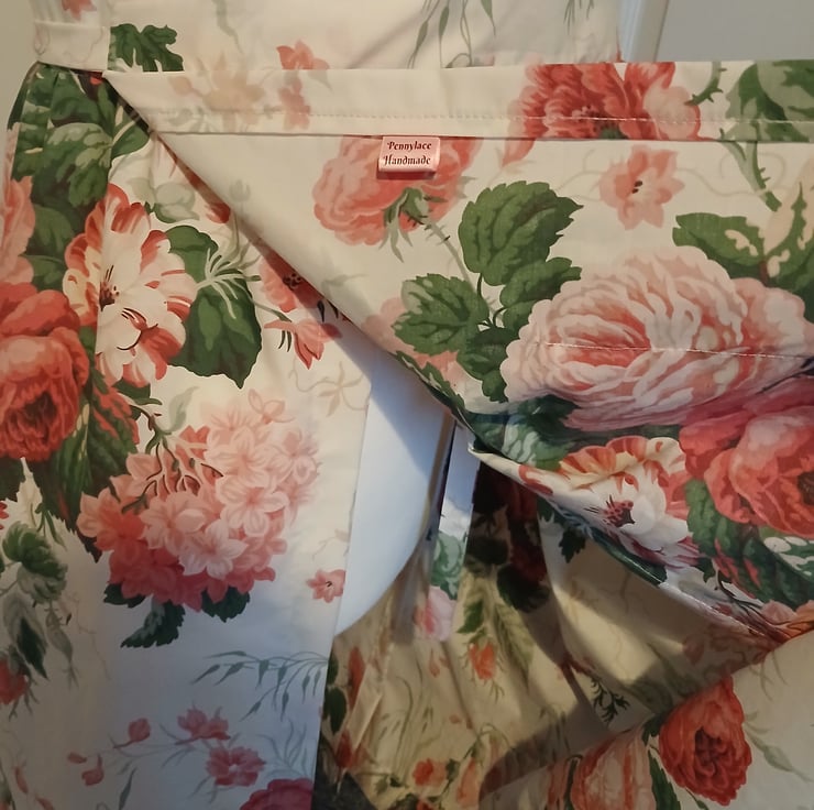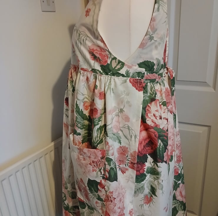 Country cottage style apron. handmade using vintage floral fabric. This item is designed to give full coverage and can be tied under front and over back to overlap or at the sides as shown in photos. It has 2 large pockets and measures 100cm from neckline to hemline.