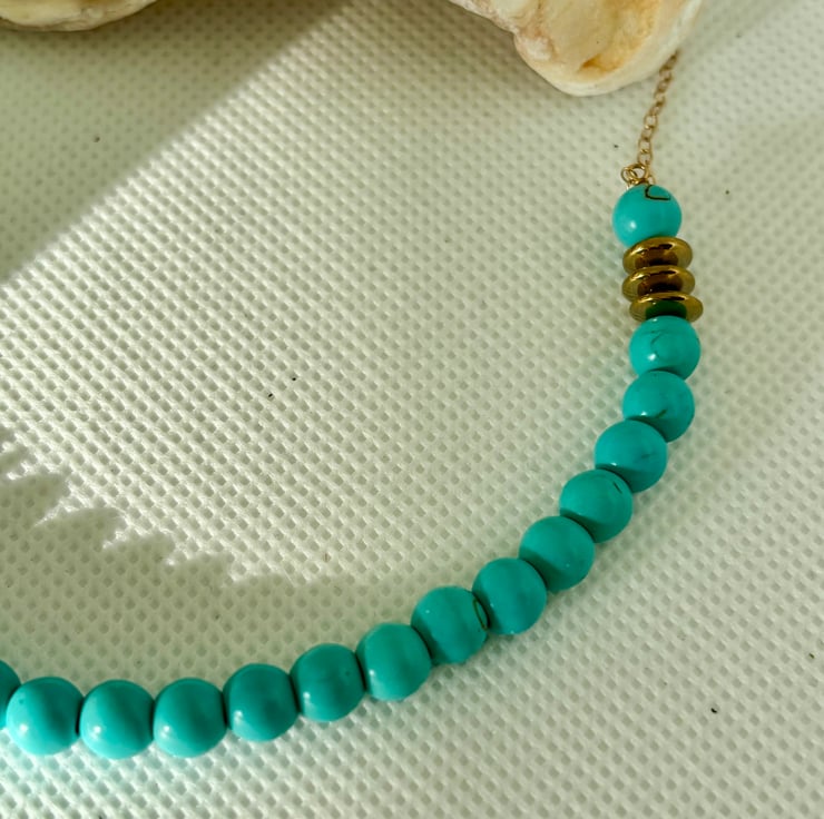 The necklace fastens with a gold filled ring clasp, accented by turquoise howlite either side of the clasp.