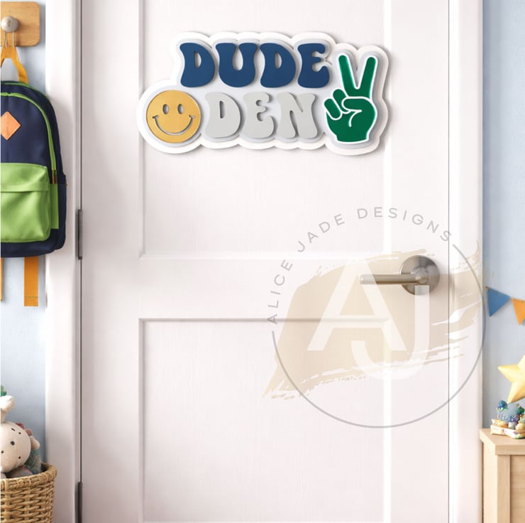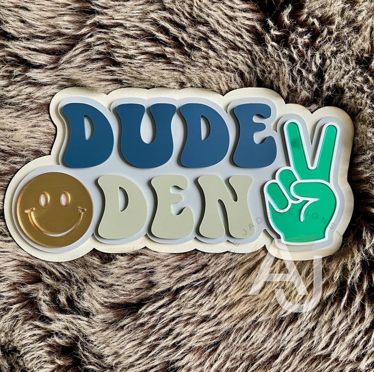 Welcome to the Dude Den! This playful acrylic sign is made for little spaces with big personality. Designed with a wooden base and layered acrylics, it features a shiny gold mirror smiley face and a green mirror peace hand for extra cool points. Full of colour, texture, and good vibes, this sign is perfect for adding a fun statement to a nursery, playroom, or kid's bedroom. A feel-good piece that brings smiles, style, and a whole lot of chill.