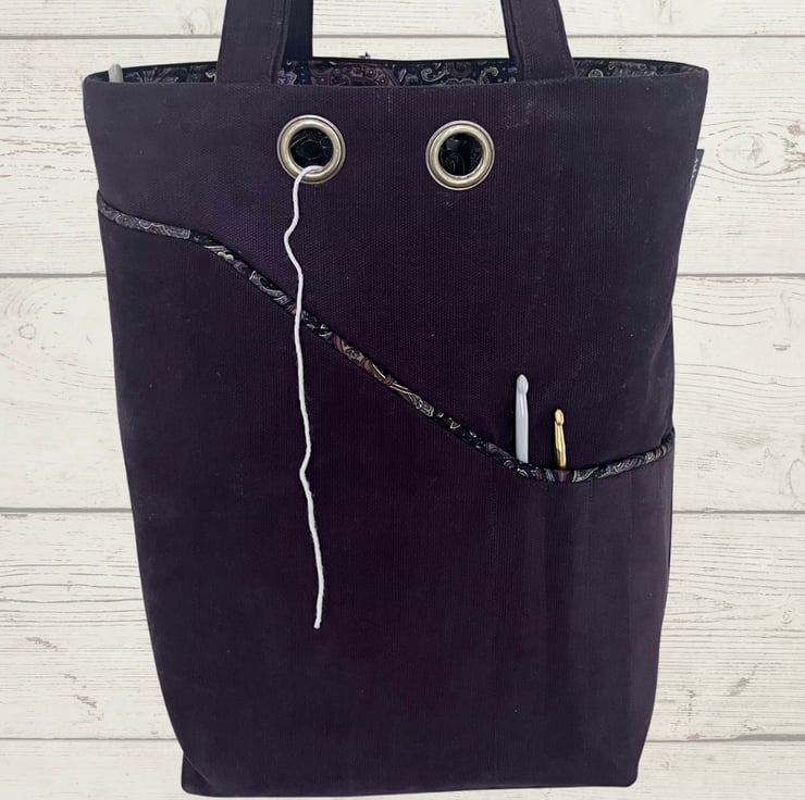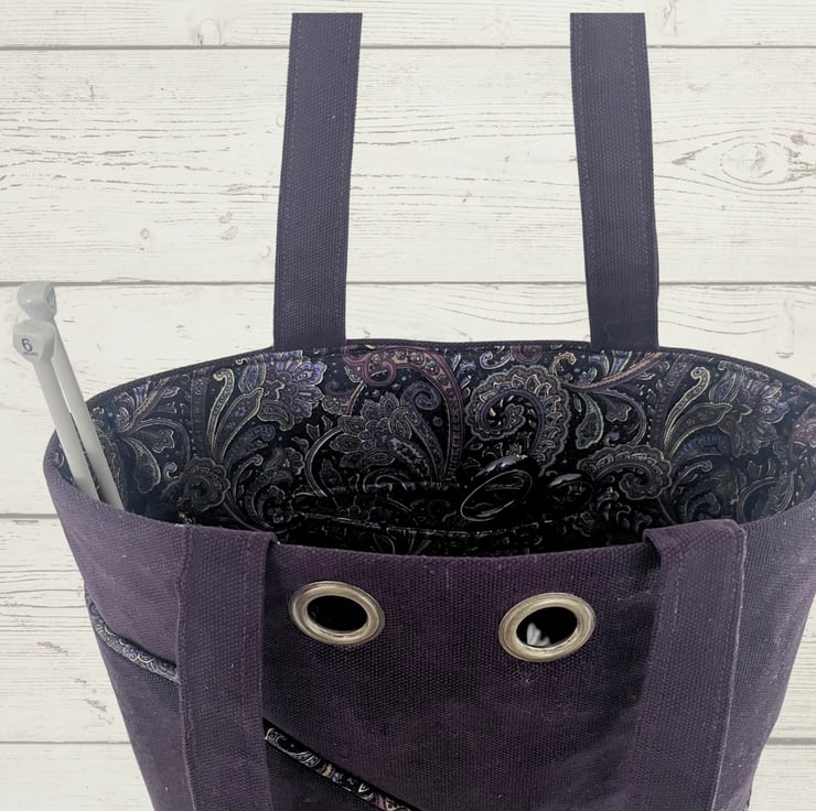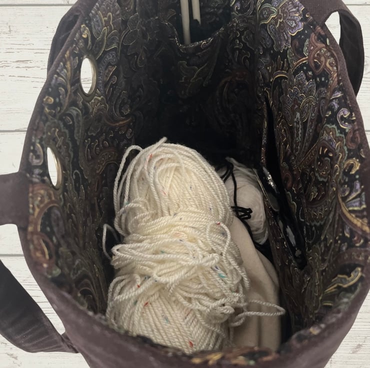 This knitting bag is made from a chocolate brown upholstery fabric and lined with a paisley cotton print .