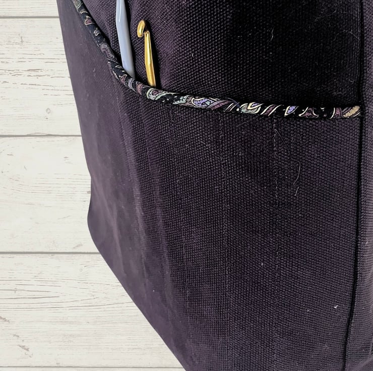 Inside the bag there is plenty of room for your wool and your piece of knitting plus a deep pocket the height of the bag allows you to store your knitting needles safely,There is an open pocket big enough to store your scissors, tape measures and any other haberdashery you will need. I’ve started to add brass feet to the bottom of the bag to protect the base.
