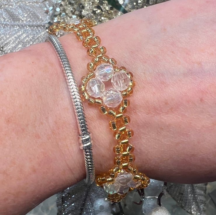 This beautiful handmade piece, inspired by popular design, truly stands out. Made with Gold seed beads and aurora borealis beads, it captures the light beautifully. Fits size 14-16cm wrist