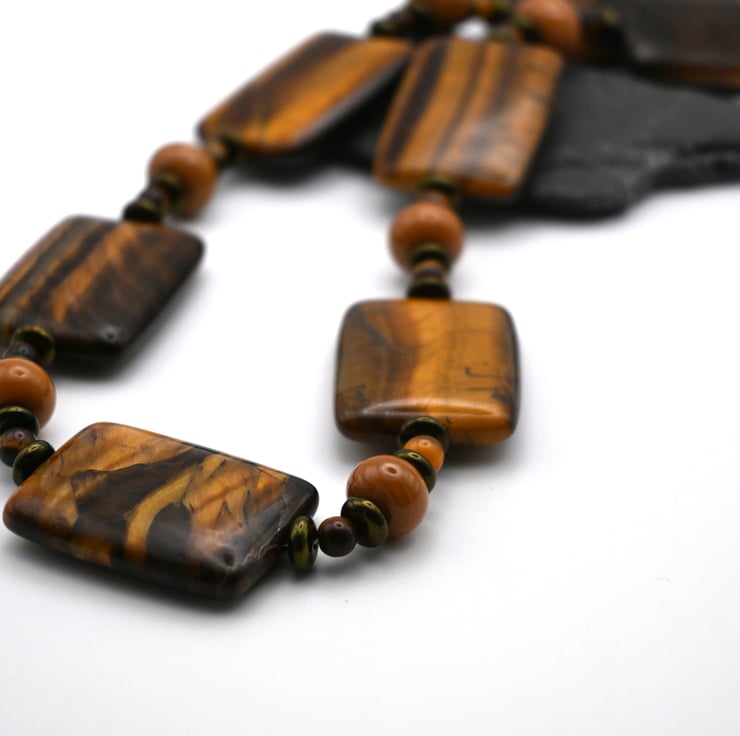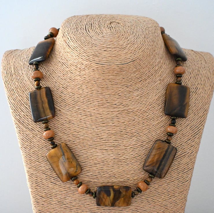 A beaded necklace made with tigers eye gemstone beads, brown Czech glass disc beads and handmade lampwork brown glass beads.
