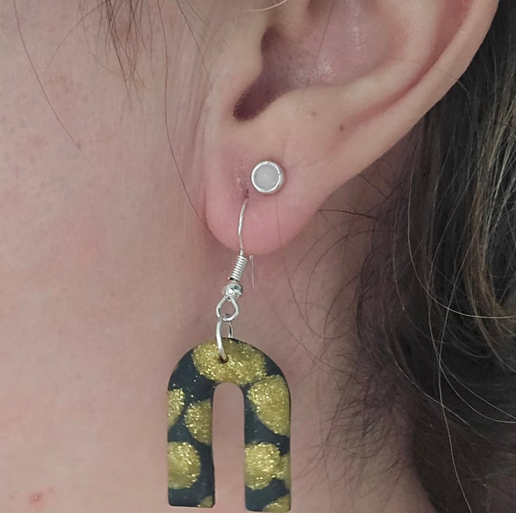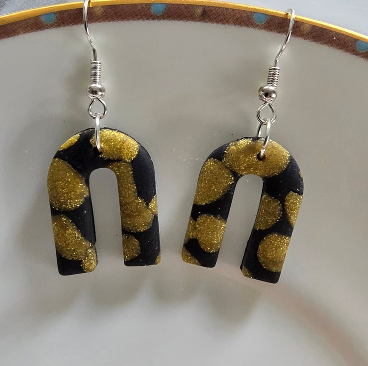 A pair of black and gold drop earrings lovingly made with polymer clay. All earrings come on silver plated ear hooks and are presented in tissue and in an organza bag ready to gift to yourself or someone else.
