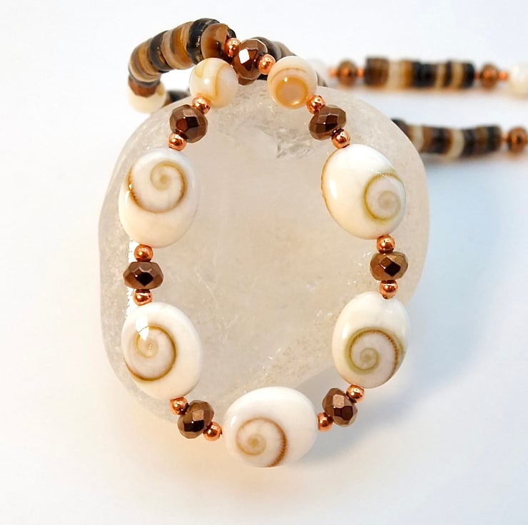 This unisex shell necklace is in neutral shades of brown, copper and cream