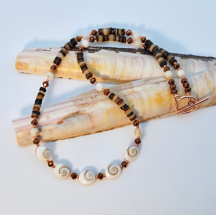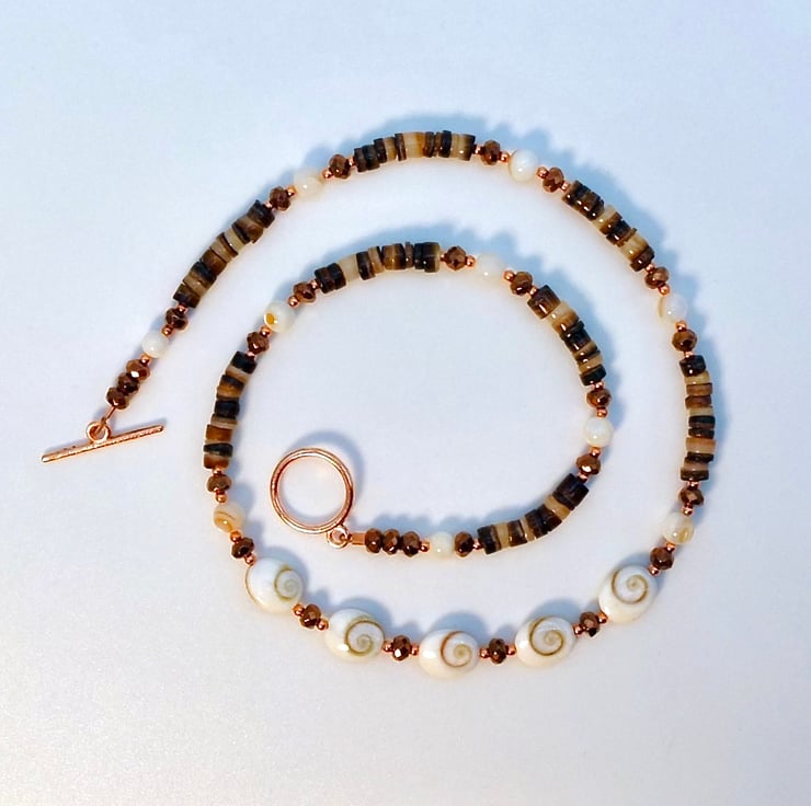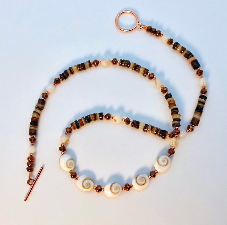 The necklace continues with rows of 4mm Brown Lip Shell heishi beads embellished with 5mm cream shell beads, copper-plated Hematite and copper spacers and fastens with a simple copper coloured toggle clasp.