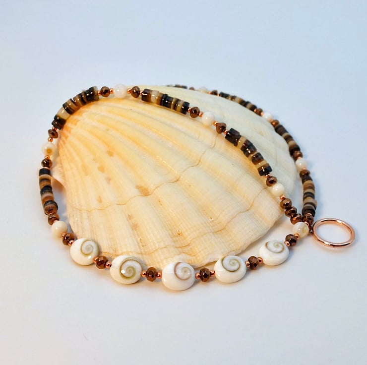 The centrepiece is a row of five 10x8mm Shiva Eye Shell beads, separated 4x3mm copper plated Hematite rondelles highlighted with 2mm pure copper spacers.