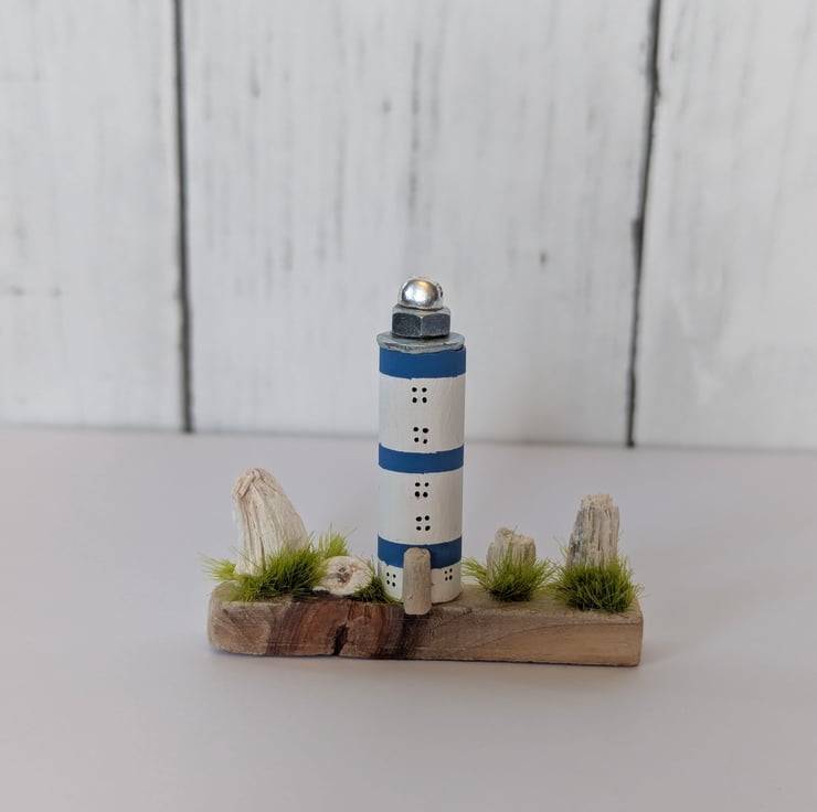 There is also a removable gift, a tiny wooden lighthouse scene on a rustic wood base.