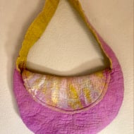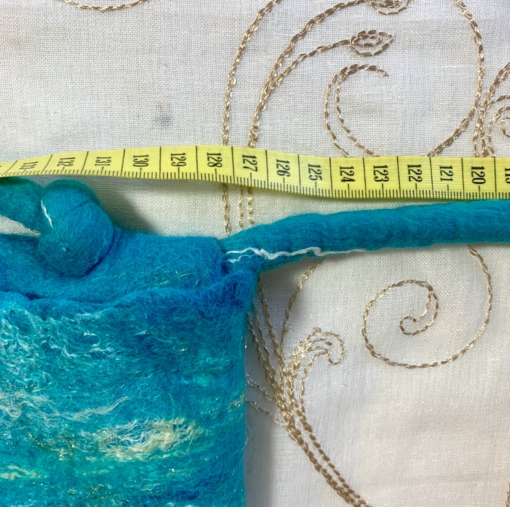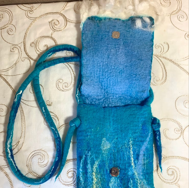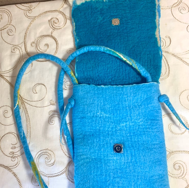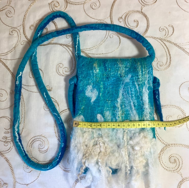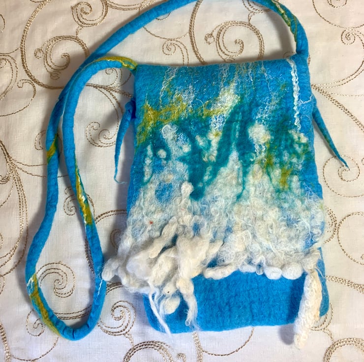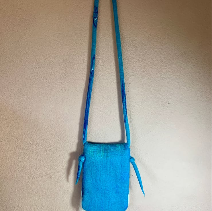 Made from soft merino wool and surprisingly sturdy. Large enough for a mobile phone and a few bits and pieces. Makes a good festival bag.