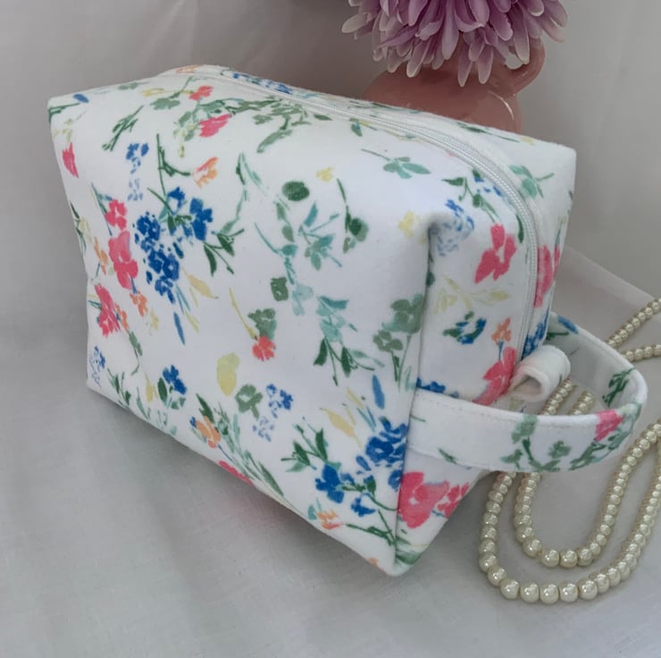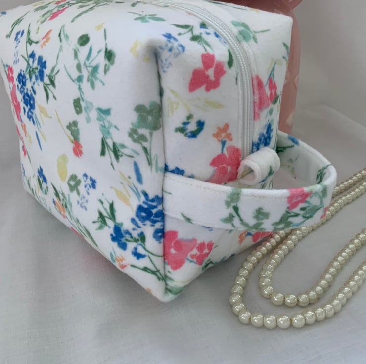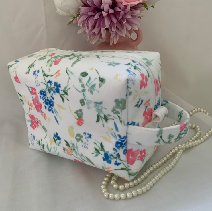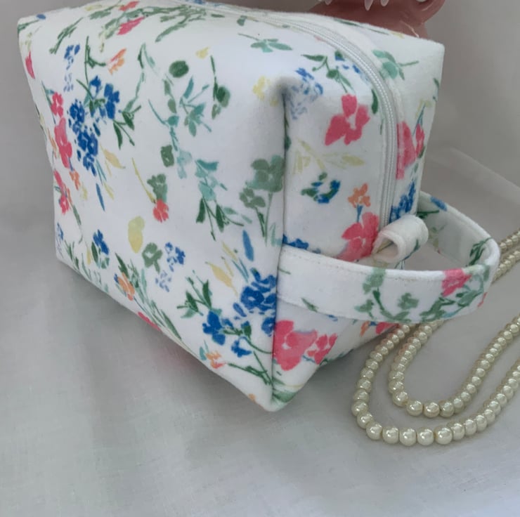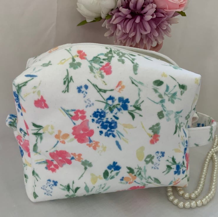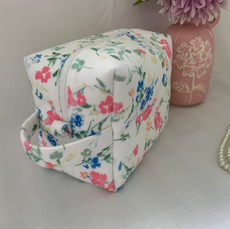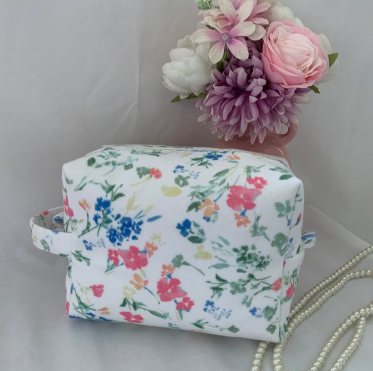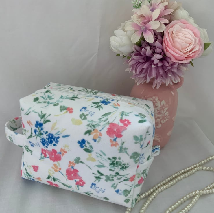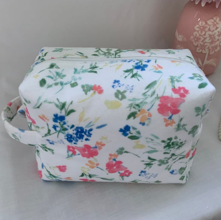 A pretty boxy toiletry bag / wash bag complete with handle and tabs. Perfect for storing your toiletries or cosmetics. It would look stylish on display in a bathroom or on a dressing table but also perfect as a travel accessory to carry your toiletries or cosmetics. This bag is interfaced to give it structure and is lined with a white water resistant fabric. The zip is finished with a handmade fabric pull.