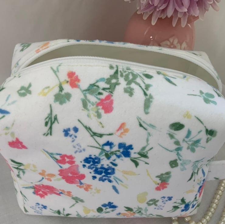Boxy Toiletry bag, large cosmetic bag, travel bag made from a pretty, soft, velour type fabric.