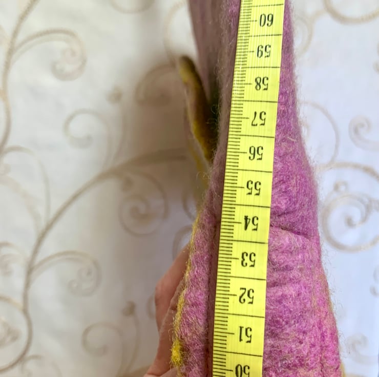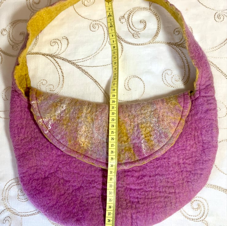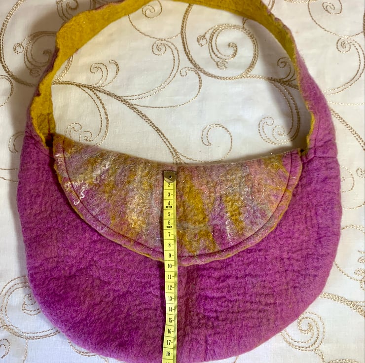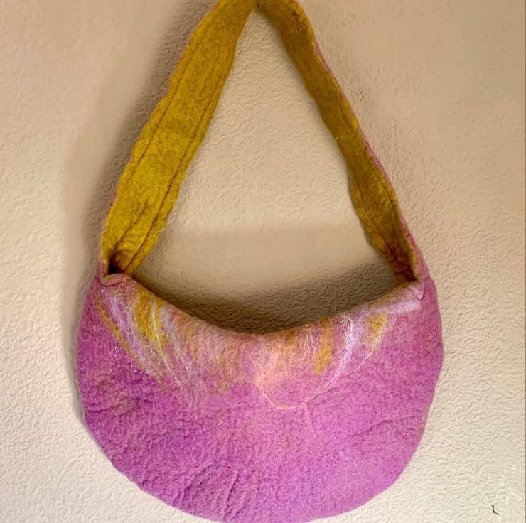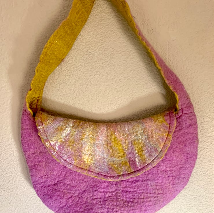Made from soft merino wool and surprisingly sturdy. Large enough for a mobile phone and a few bits and pieces. Based on a circular design and lovely for tucking under the arm!