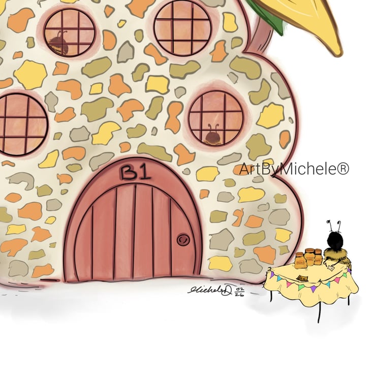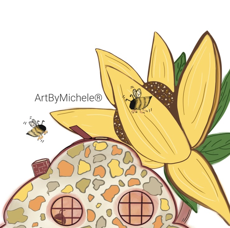 From my whimsy imagination to your walls! I created this piece with spring, sunflowers and bees in mind. Using a warm spring & summer colour palette. Of course i wanted to add a little whimsy and humour to bring together this piece. With the hive as a comfy retreat for all the worker honey bees and the little honey pots for sale!