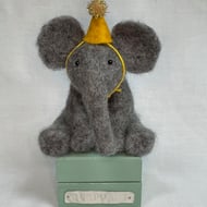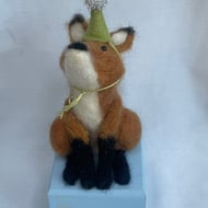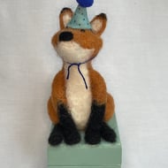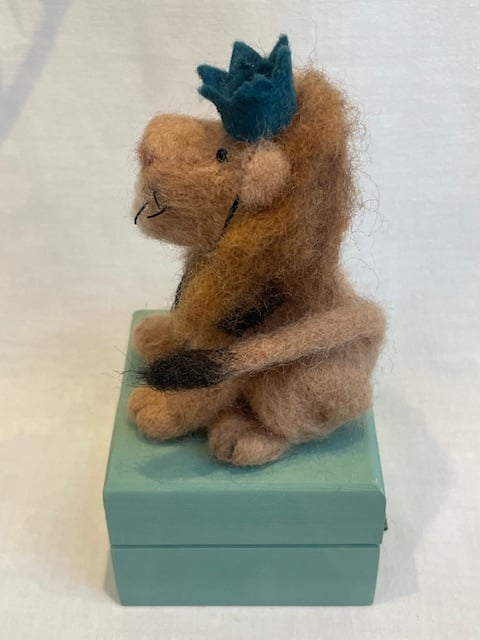 The lion is made using needle felting wool, has glass eyes, wire whiskers and a removable teal fabric party hat. It measures approx. 10 cm (H) x 7 cm (W) x 7 cm (D)