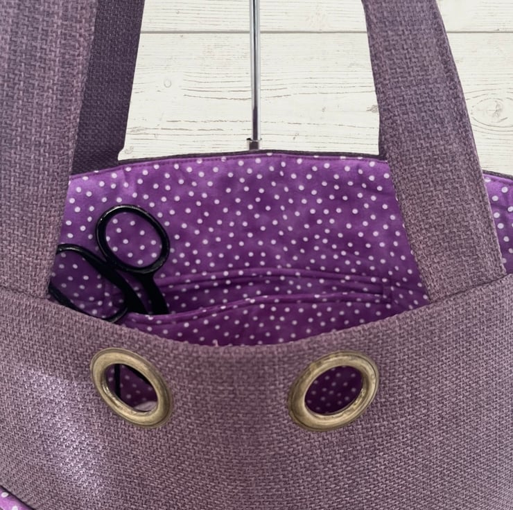 Inside the bag there is plenty of room for your wool and your piece of knitting plus a deep pocket the height of the bag allows you to store your knitting needles safely,There is an open pocket big enough to store your scissors, tape measures and any other haberdashery you will need. I’ve started to add brass feet to the bottom of the bag to protect the base.