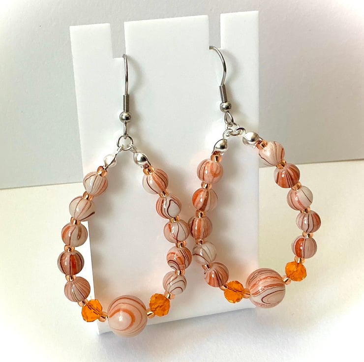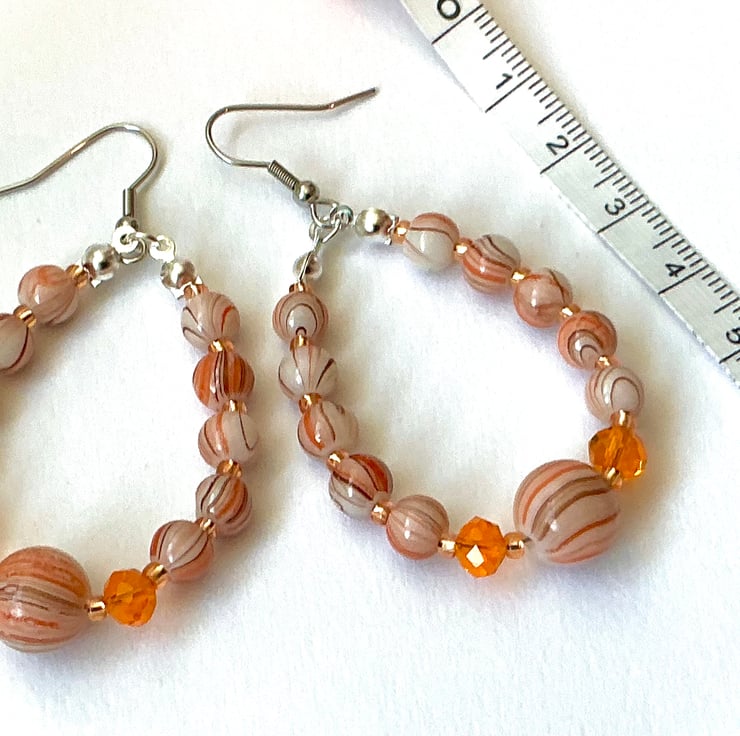 These ever popular beaded hoop design earrings never ceases to please and this pair made using randomly striped Orange beads is no exception. With the addition of faceted glass beads in a bright Orange which catch the light very nicely. Shiny glass seed beads make perfect spacers and they are finished off with strong stainless steel ear wires.