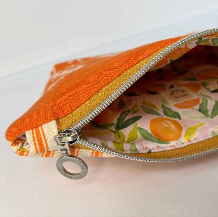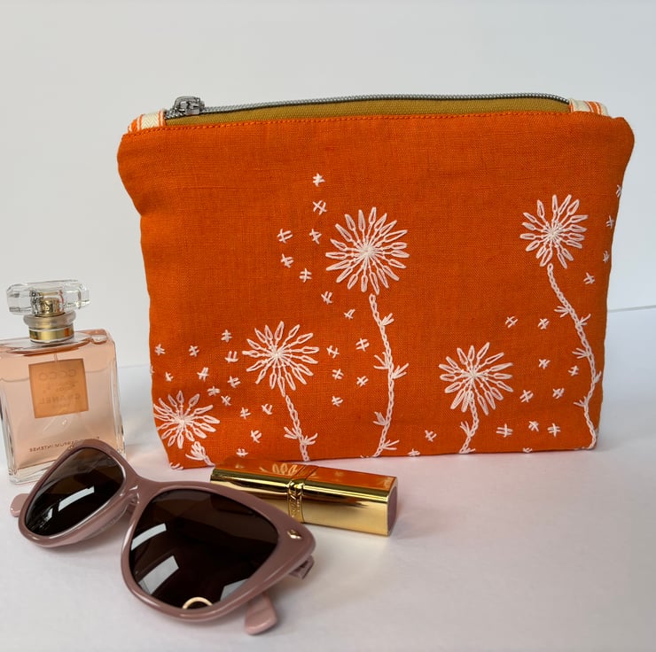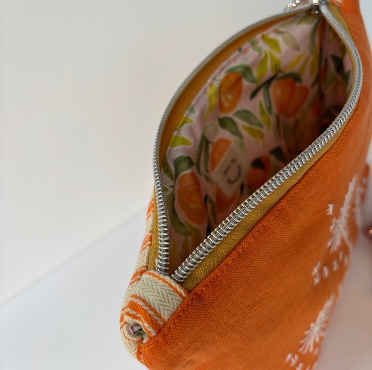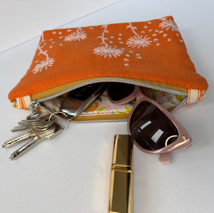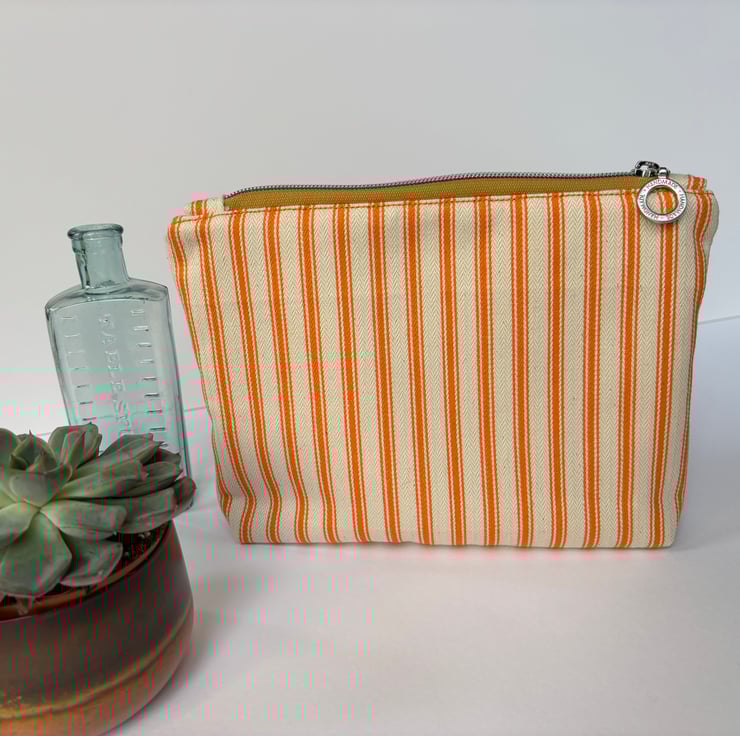 A versatile zip top purse / pouch / small bag. Made from a gorgeous Linen with hand stitched detail on the front, the back is canvas ticking in a complimentary cream and orange.