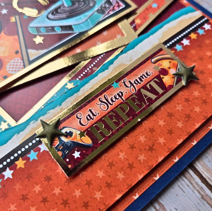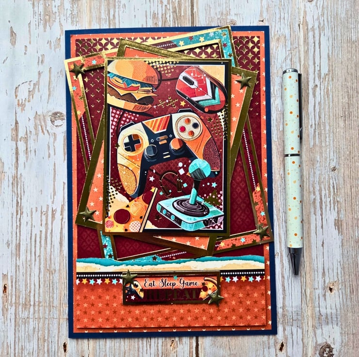 Level up their birthday with this vibrant handmade gamer birthday card, perfect for anyone who lives by the motto: Eat. Sleep. Game. Repeat.