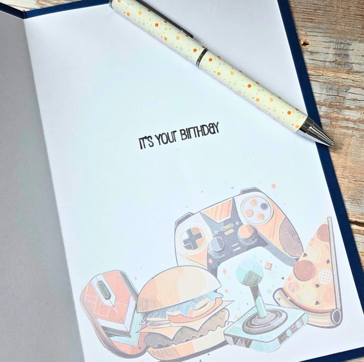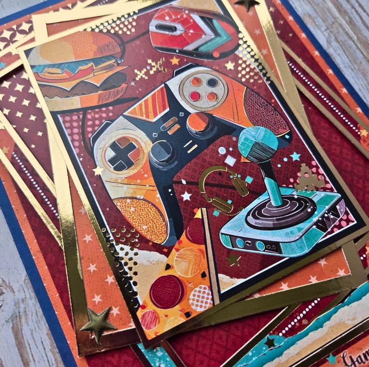 Made on a blue card base layered with quality cardstock in bright, bold colours and playful gaming images, this card is a standout keepsake for gamers of all ages.