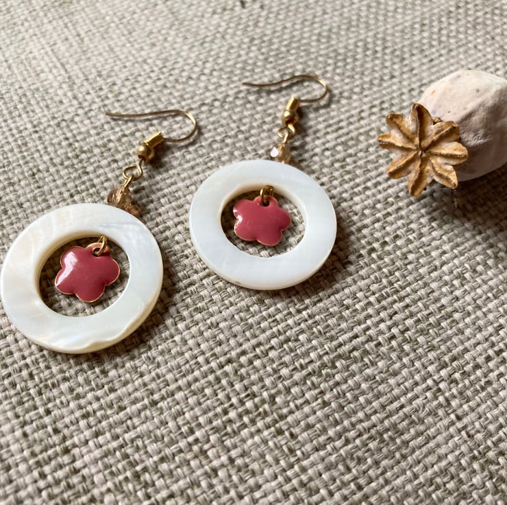 Pretty earrings with a pinky metal flower charm set in a shell hoop, with a gold crystal and gold-plated earring hooks. Approximately 5cm in length including hook.