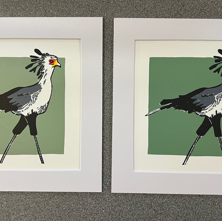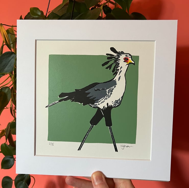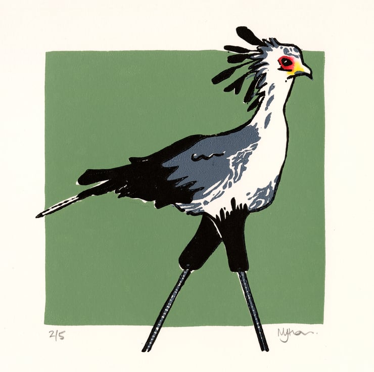 This is a print of a Secretary Bird sold mounted and unframed. Printed with Caligo Safewash Oil Based printing ink on quality acid-free print paper using a Woodzilla hand press. The design made use of 3 colour blocks and eye detail added with graphic markers.