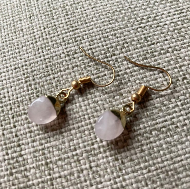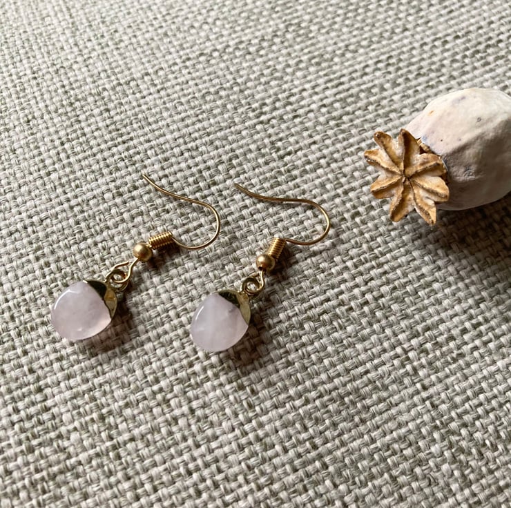 Pretty earrings made with faceted rose quartz tipped with gold plate, and gold-plated earring hooks. Approximately 3cm in length including hook.