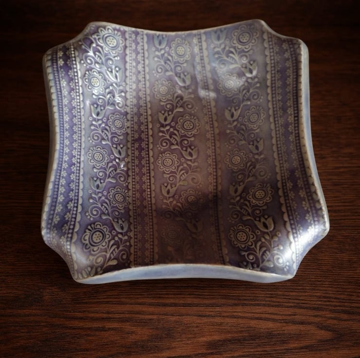 A handbuilt ceramic trinket dish in a Lavender glaze.