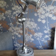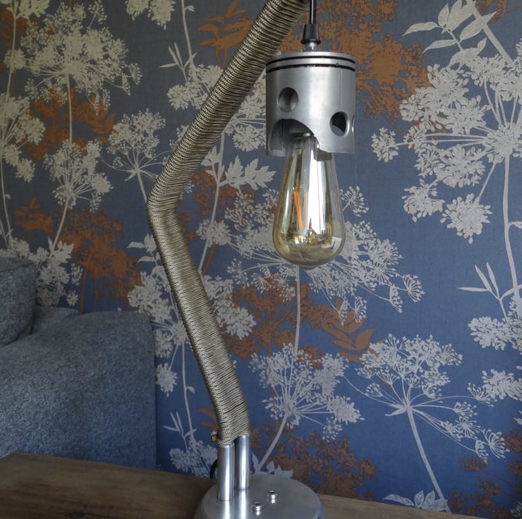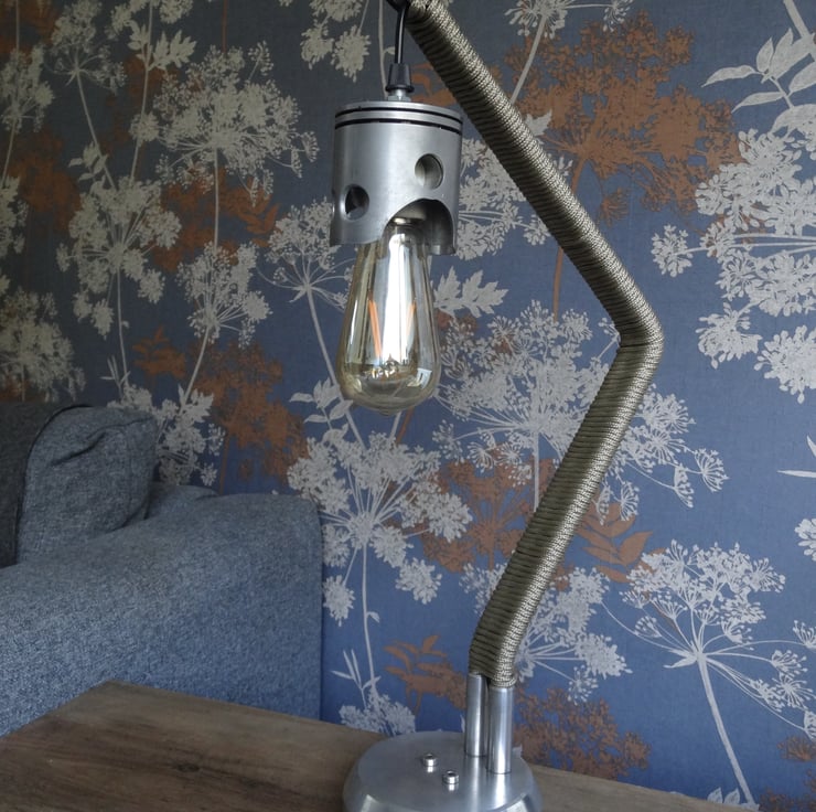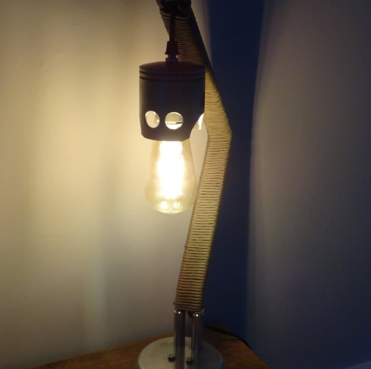 This started with a billet of aluminium - turned on my lathe to produce a suitable (weighted) base. More turned aluminium holds mild steel solid bar to act as the arm for the lamp. These bars are wrapped in neutral tan coloured cord. A E27 (large screw) bulb holder is fitted to a modified motorcycle piston (Yamaha DT250MX).
