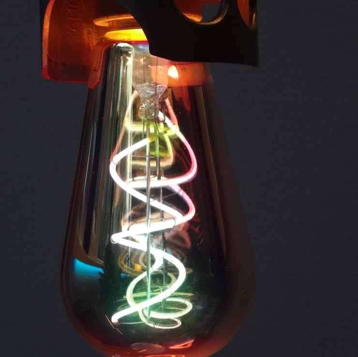 This lamp comes with two different bulbs - both dimmable. The first is a neutral white light (with a clear bulb) and the second is a trick metallic opal bulb that looks amazing!